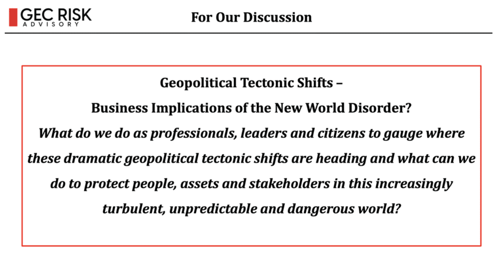 The group agreed that it was best for us as citizens, decision-makers and members of leadership teams or boards to maintain a high level of awareness and alertness about the world around us by consuming trustworthy and factually reliable sources of geopolitical information and analysis including the The Economist, Financial Times The New York Times and newsletters such as those from Axios and SEMAFOR.