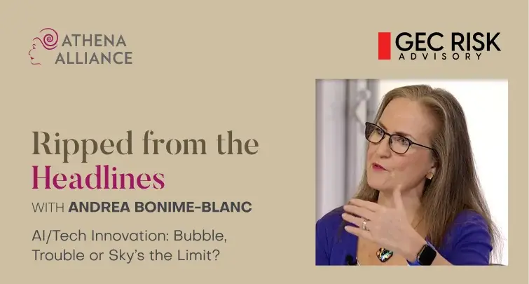 As AI investment surges to unprecedented heights, Athena’s October “Ripped from the Headlines” Salon—led by Andrea Bonime-Blanc—dives into whether we’re witnessing a fleeting bubble, looming trouble, or the dawn of a transformative new era.