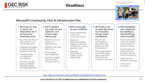 I started our discussion by highlighting key trends and developments in ESG and DEI, presenting headlines and trend lines from various sources, including regulatory actions, corporate responses, and industry-specific impacts. The discussion included an example from Microsoft’s announcement of a community-first AI infrastructure plan, which aims to address concerns about data center construction and operation. Below is a reproduction of what Microsoft announced this week.
