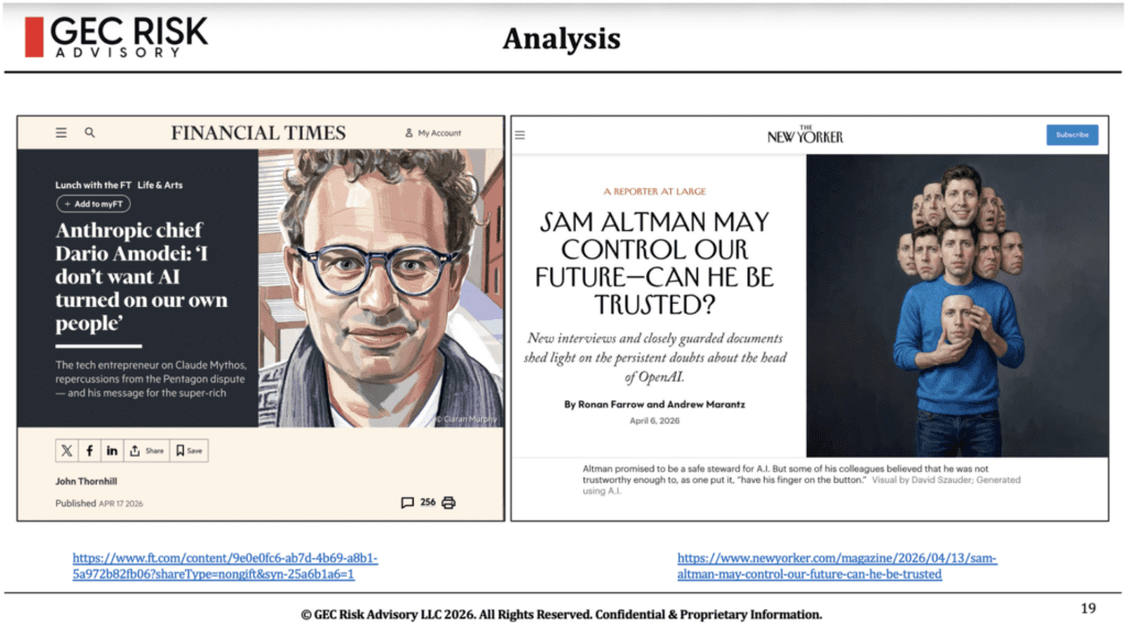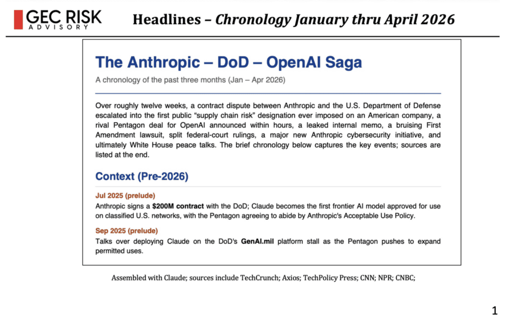 I presented a comprehensive chronology of the conflict, which began with the DOD designating Anthropic as a supply chain risk and culminated in Anthropic’s unveiling of Project Glasswing, a cybersecurity initiative involving thousands of zero-day vulnerabilities.