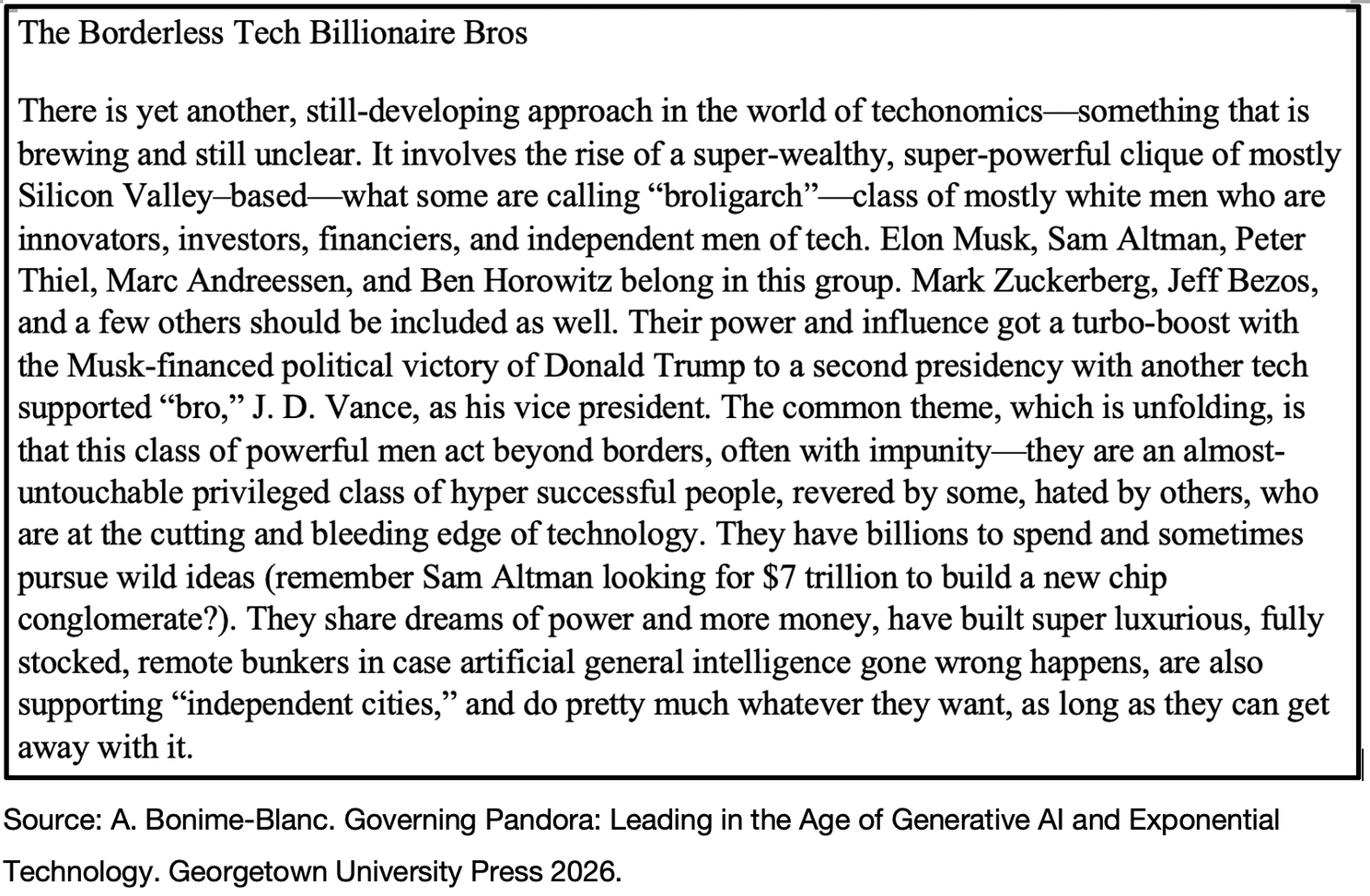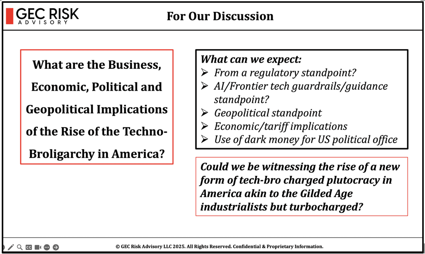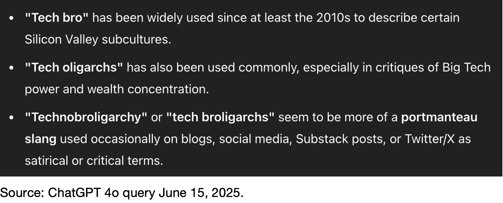 I presented the concept of the tech “broligarchy,” —a widely used critique of tech-elite influence in government, particularly in the United States, and shared some origins of the “Tech Broligarchy” from ChatGPT 4o – based research. See graphic below.